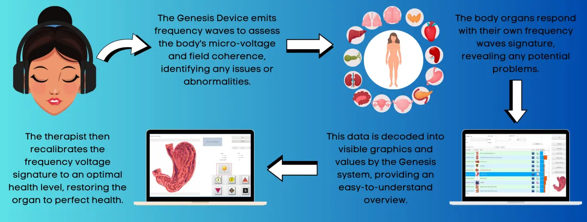 The Genesis device acts like a super-sensitive radio tuner for your body. It scans your body to detect the frequencies of your organs. If an organ’s frequency is off, similar to a radio station not being tuned correctly, it indicates that the organ might not be functioning well. The device then compares the detected frequencies with a database of healthy frequencies, identifying any discrepancies or abnormalities much like recognizing when a radio station isn’t coming in clearly.